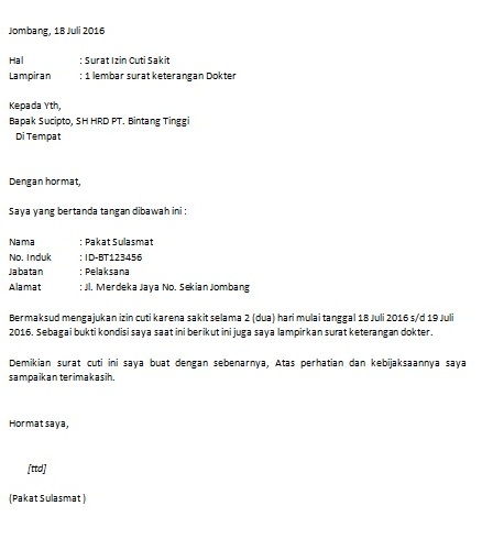 Bermaksud mengajukan izin cuti karena sakit selama 2 (dua) hari mulai tanggal 18 Juli 2016 s/d 19 Juli 2016. Sebagai bukti kondisi saya saat ini berikut ini juga saya lampirkan surat keterangan dokter.